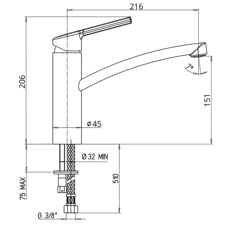 De uitloop van 216 mm biedt voldoende ruimte voor alle keukenwerkzaamheden, zoals het vullen van pannen of het schoonspoelen van de spoelbak. Dankzij de duurzame keramische cartouche werkt de kraan jarenlang probleemloos zonder lekkages. Het kraangat van 35 mm en de standaard 3/8” flexibele aansluitslangen zorgen voor een snelle en eenvoudige installatie.