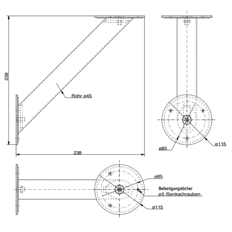 Stevige en stijlvolle schuine wandsteun voor werkbladen en barbladen. Gemaakt van RVS-look met een diameter van 45 mm en hoogte 180 mm, perfect voor moderne keukens, bars of werkruimtes. Eenvoudig te monteren en duurzaam in gebruik.
