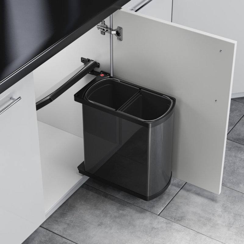 Compact inbouw afvalsysteem met automatische dekselopening en meenemer aan de deur. Ideaal voor gescheiden afvalinzameling in kleine tot middelgrote keukens dankzij de 2-voudige afvalscheiding.