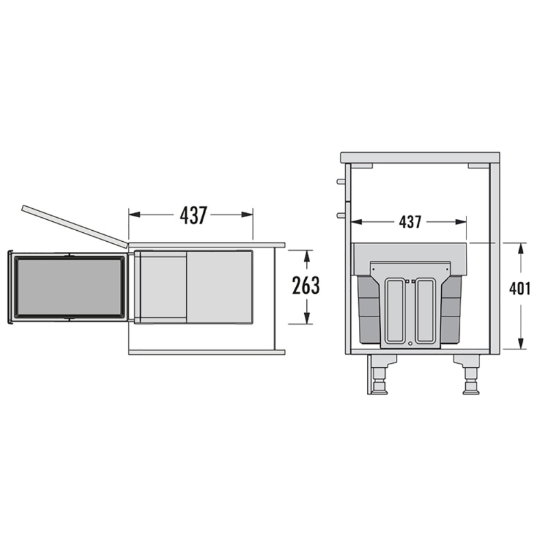 Het systeem is geschikt voor keukenkasten vanaf 40 cm breed, wordt gemonteerd op de bodem van de kast en heeft compacte afmetingen van 401 x 263 x 437 mm, waardoor het probleemloos in standaard keukenkasten past.
