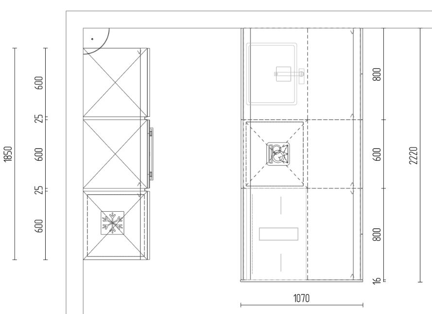 De getoonde keuken heeft een afmeting van 305 en 203 cm