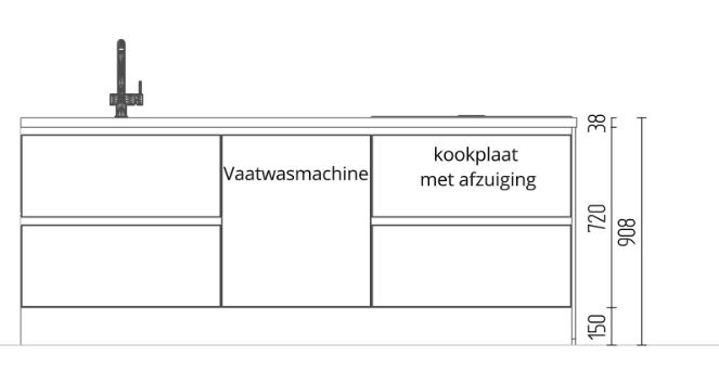 Wilt u deze keuken groter of kleiner? Geen probleem! De maatvoering kan volledig worden aangepast naar uw wensen. Afhankelijk van de gekozen afmeting berekenen wij een meer- of minderprijs.