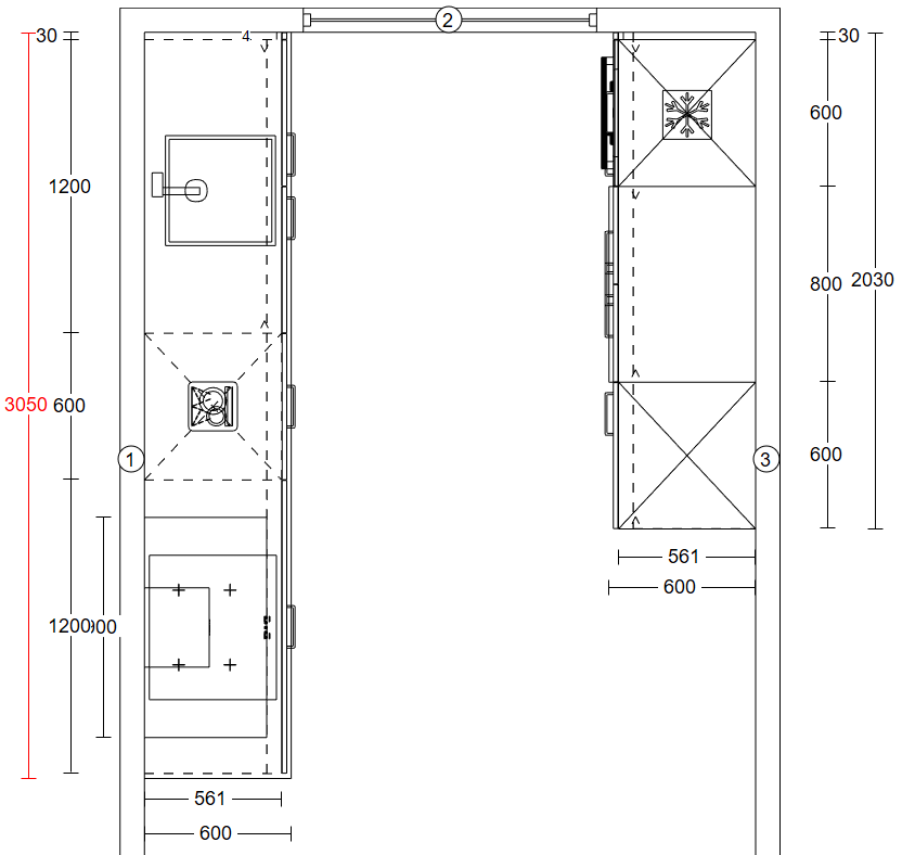 De getoonde keuken heeft een afmeting van 305 en 203 cm