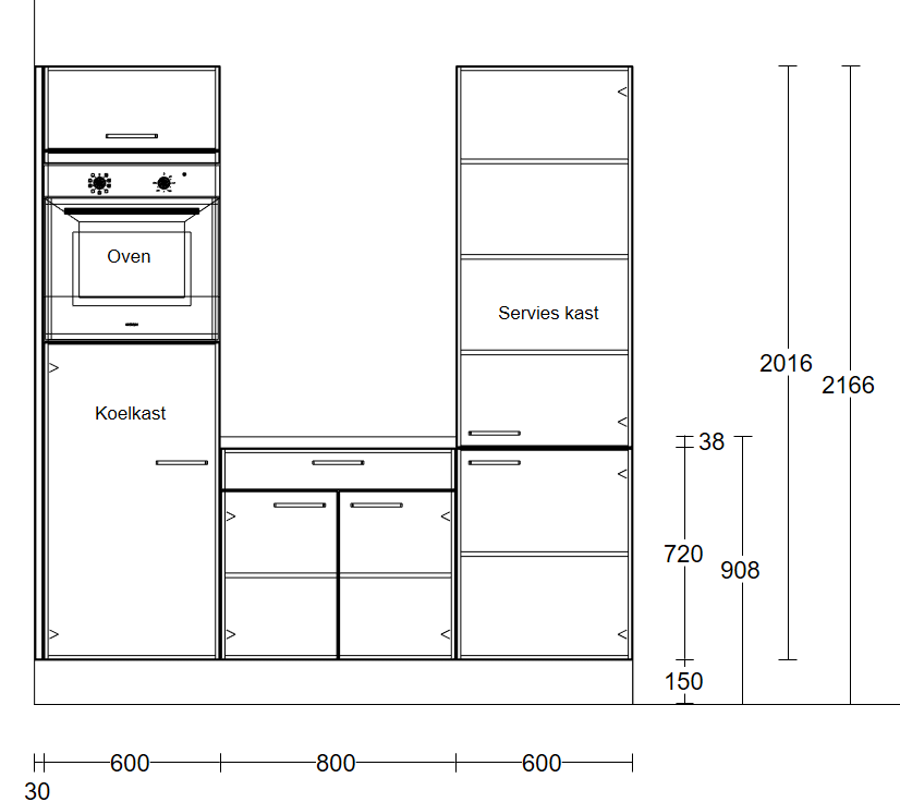 Wilt u deze keuken groter of kleiner? Geen probleem! De maatvoering kan volledig worden aangepast naar uw wensen. Afhankelijk van de gekozen afmeting berekenen wij een meer- of minderprijs.