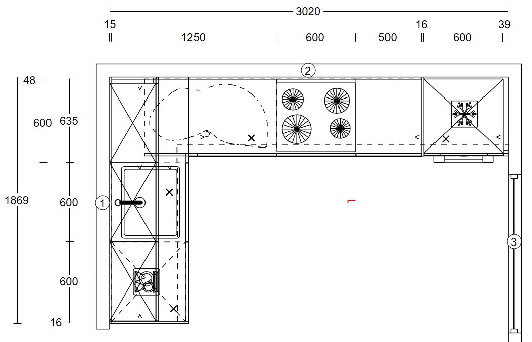 De getoonde keuken heeft een afmeting van 186,9 en 302 cm
