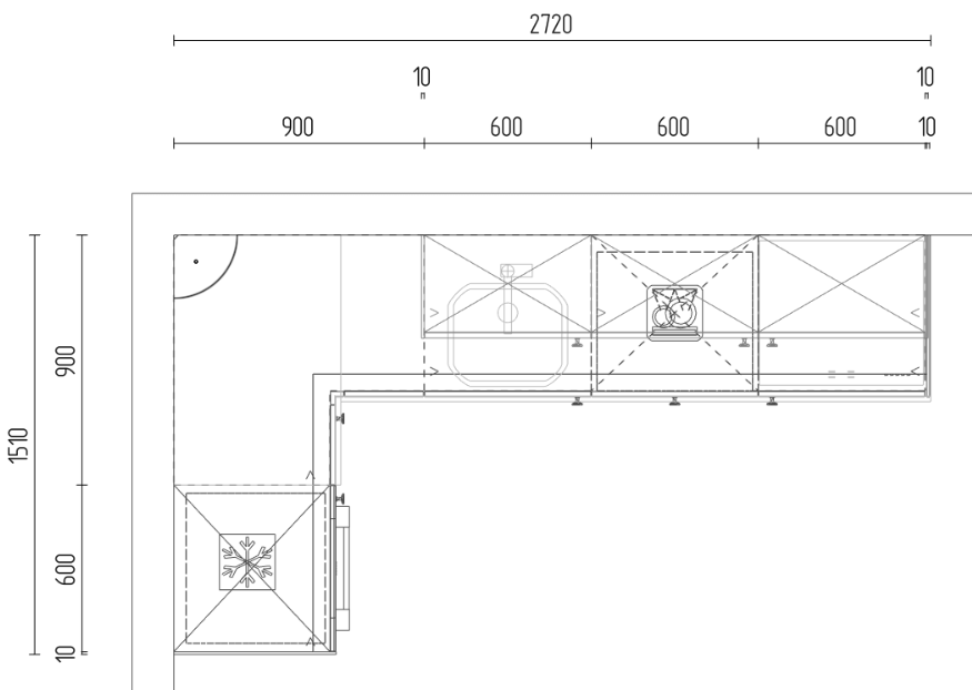 De getoonde keuken heeft een afmeting van 1.51 x 2.72 meter.