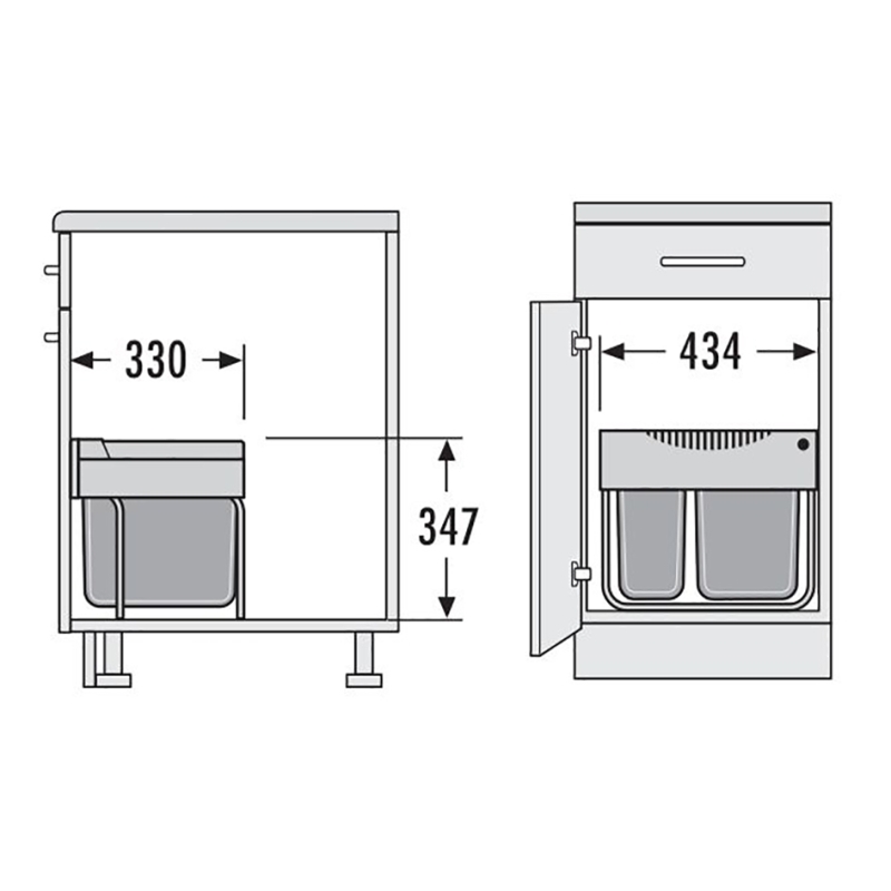 Het systeem past in kasten vanaf 50 cm breed en wordt gemonteerd op de bodem. Met afmetingen van 347 x 434 x 330 mm is het geschikt voor standaard brede keukenkasten.